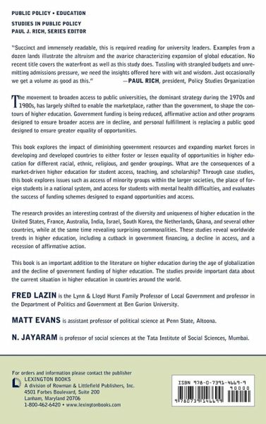 The movement to broaden access to public universities, the dominant strategy during the 1970s and 1980s, has largely shifted to enable the marketplace, rather than the government, to shape the contours of higher education. Government funding is being reduced, affirmative action and other programs designed to insure broader access are in decline and personal fulfillment is replacing a public good designed to insure greater equality of opportunities. This book explores the impact of diminishing government resources and expanding market forces in developing and developed countries to either foster or lessen equality of opportunities in higher education for different racial, ethnic, religious and gender groupings. What are the consequences of a market-driven higher education for student access, teaching and scholarship? Through case studies, this book explores issues such as access of minority groups within the larger societies, the place of foreign students in a national system, and access for students with mental health difficulties, and evaluates the success of funding schemes designed to expand opportunities and access. The research provides an interesting contrast of the diversity and uniqueness of higher education in the United States, France, Australia, India, Israel, South Korea, The Netherlands, Ghana and several other countries, while at the same time revealing surprising commonalities. These studies reveal world-wide trends in higher education including a cutback in government financing, a decline in access, and a receding of affirmative action. This book is an important addition to the literature on higher education during the age of globalization and the decline of government funding of higher education. The studies provide important data about the current situation in higher education in countries around the world.