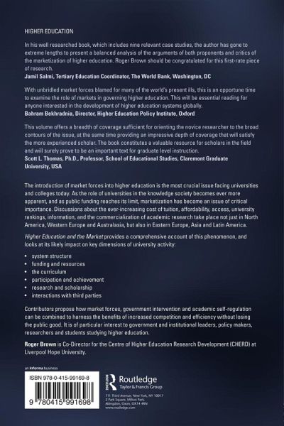 The introduction of market forces into higher education is the most crucial issue facing universities and colleges today. As the role of universities in the knowledge society becomes ever more apparent, and as public funding reaches its limit, marketisation has become an issue of critical importance. Discussions about the ever-increasing cost of tuition, affordability, access, university rankings, information, and the commercialization of academic research take place not just in North America, Western Europe and Australasia, but also in Eastern Europe, Asia and Latin America. Higher Education and the Market provides a comprehensive account of this phenomenon, and looks at its likely impact on key dimensions of university activity: system structure funding and resources the curriculum participation and achievement research and scholarship interactions with third parties. Contributors propose how market forces, government intervention and academic self-regulation can be combined to harness the benefits of increased competition and efficiency without losing the public good. It is of particular interest to government and institutional leaders, policy makers, researchers and students studying higher education.