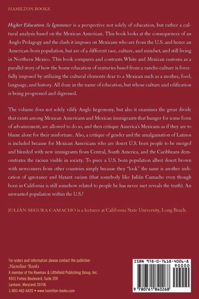 Higher Education as Ignorance is a perspective not solely of education, but rather a cultural analysis based on the Mexican American. This book looks at the consequences of an Anglo Pedagogy and the clash it imposes on Mexicans who are from the U.S. and hence an American-born population, but are of a different race, culture, and mindset, and still living in Northern Mexico.