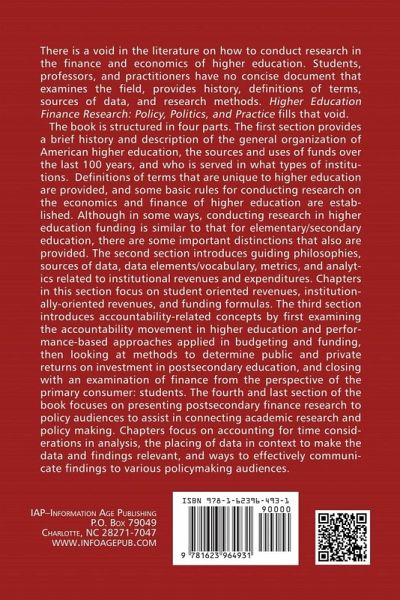 A volume in Conducting Research in Education Finance: Methods, Measurement, and Policy Perspectives Series Editors David C. Thompson, Kansas State University and Faith E. Crampton, University Wisconsin-Milwaukee There is a void in the literature on how to conduct research in the finance and economics of higher education. Students, professors, and practitioners have no concise document that examines the field, provides history, definitions of terms, sources of data, and research methods. Higher Education Finance Research: Policy, Politics, and Practice fills that void. The book is structured in four parts. The first section provides a brief history and description of the general organization of American higher education, the sources and uses of funds over the last 100 years, and who is served in what types of institutions. Definitions of terms that are unique to higher education are provided, and some basic rules for conducting research on the economics and finance of higher education are established. Although in some ways, conducting research in higher education funding is similar to that for elementary/secondary education, there are some important distinctions that also are provided. The second section introduces guiding philosophies, sources of data, data elements/vocabulary, metrics, and analytics related to institutional revenues and expenditures. Chapters in this section focus on student oriented revenues, institutionally-oriented revenues, and funding formulas. The third section introduces accountability-related concepts by first examining the accountability movement in higher education and performance-based approaches applied in budgeting and funding, then looking at methods to determine public and private returns on investment in postsecondary education, and closing with an examination of finance from the perspective of the primary consumer: students. The fourth and last section of the book focuses on presenting postsecondary finance research to policy audiences to assist in connecting academic research and policy making. Chapters focus on accounting for time considerations in analysis, the placing of data in context to make the data and findings relevant, and ways to effectively communicate findings to various policy-making audiences.