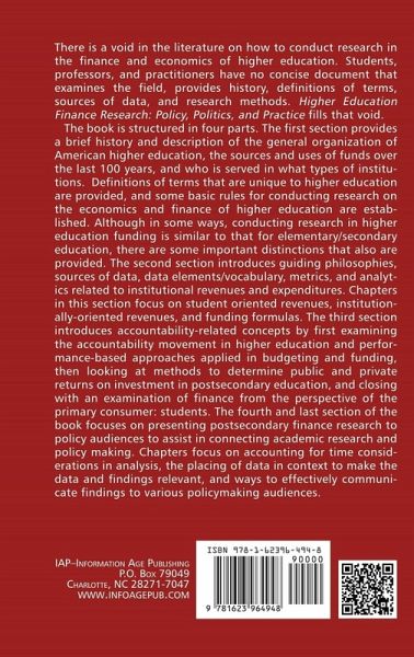 A volume in Conducting Research in Education Finance: Methods, Measurement, and Policy Perspectives Series Editors David C. Thompson, Kansas State University and Faith E. Crampton, University Wisconsin-Milwaukee There is a void in the literature on how to conduct research in the finance and economics of higher education. Students, professors, and practitioners have no concise document that examines the field, provides history, definitions of terms, sources of data, and research methods. Higher Education Finance Research: Policy, Politics, and Practice fills that void. The book is structured in four parts. The first section provides a brief history and description of the general organization of American higher education, the sources and uses of funds over the last 100 years, and who is served in what types of institutions. Definitions of terms that are unique to higher education are provided, and some basic rules for conducting research on the economics and finance of higher education are established. Although in some ways, conducting research in higher education funding is similar to that for elementary/secondary education, there are some important distinctions that also are provided. The second section introduces guiding philosophies, sources of data, data elements/vocabulary, metrics, and analytics related to institutional revenues and expenditures. Chapters in this section focus on student oriented revenues, institutionally-oriented revenues, and funding formulas. The third section introduces accountability-related concepts by first examining the accountability movement in higher education and performance-based approaches applied in budgeting and funding, then looking at methods to determine public and private returns on investment in postsecondary education, and closing with an examination of finance from the perspective of the primary consumer: students. The fourth and last section of the book focuses on presenting postsecondary finance research to policy audiences to assist in connecting academic research and policy making. Chapters focus on accounting for time considerations in analysis, the placing of data in context to make the data and findings relevant, and ways to effectively communicate findings to various policy-making audiences.