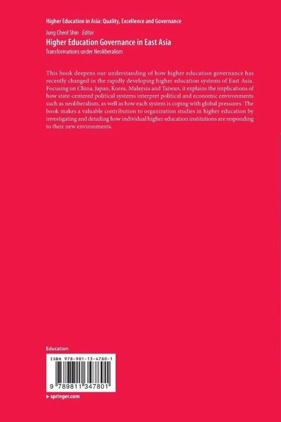 This book deepens our understanding of how higher education governance has recently changed in the rapidly developing higher education systems of East Asia. Focusing on China, Japan, Korea, Malaysia and Taiwan, it explains the implications of how state-centered political systems interpret political and economic environments such as neoliberalism, as well as how each system is coping with global pressures. The book makes a valuable contribution to organization studies in higher education by investigating and detailing how individual higher education institutions are responding to their new environments.