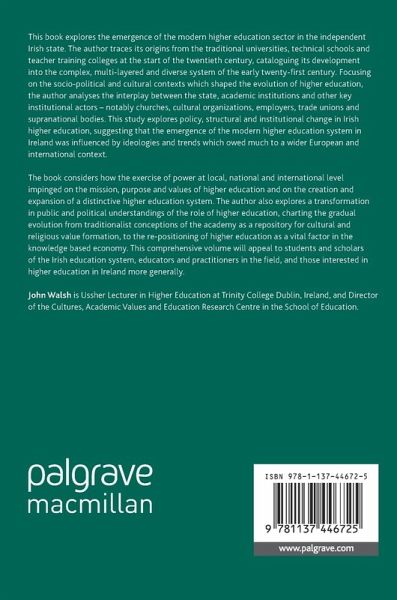 This book explores the emergence of the modern higher education sector in the independent Irish state. The author traces its origins from the traditional universities, technical schools and teacher training colleges at the start of the twentieth century, cataloguing its development into the complex, multi-layered and diverse system of the early twenty-first century. Focusing on the socio-political and cultural contexts which shaped the evolution of higher education, the author analyses the interplay between the state, academic institutions and other key institutional actors - notably churches, cultural organizations, employers, trade unions and supranational bodies. This study explores policy, structural and institutional change in Irish higher education, suggesting that the emergence of the modern higher education system in Ireland was influenced by ideologies and trends which owed much to a wider European and international context. The book considers how the exercise of power at local, national and international level impinged on the mission, purpose and values of higher education and on the creation and expansion of a distinctive higher education system. The author also explores a transformation in public and political understandings of the role of higher education, charting the gradual evolution from traditionalist conceptions of the academy as a repository for cultural and religious value formation, to the re-positioning of higher education as a vital factor in the knowledge based economy. This comprehensive volume will appeal to students and scholars of the Irish education system, educators and practitioners in the field, and those interested in higher education in Ireland more generally.