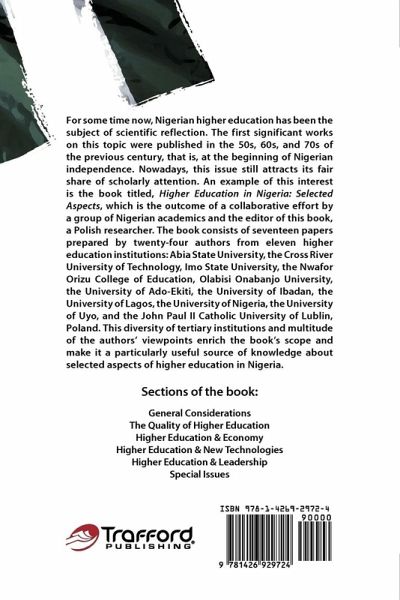 For some time now, Nigerian higher education has been the subject of scientific reflection. The first significant works on this topic were published in the 50s, 60s, and 70s of the previous century, that is, at the beginning of Nigerian independence. Nowadays, this issue still attracts its fair share of scholarly attention. An example of this interest is the book titled, Higher Education in Nigeria: Selected Aspects, which is the outcome of a collaborative effort by a group of Nigerian academics and the editor of this book, a Polish researcher. The book consists of seventeen papers prepared by twenty-four authors from eleven higher education institutions: Abia State University, the Cross River University of Technology, Imo State University, the Nwafor Orizu College of Education, Olabisi Onabanjo University, the University of Ado-Ekiti, the University of Ibadan, the University of Lagos, the University of Nigeria, the University of Uyo, and the John Paul II Catholic University of Lublin, Poland. This diversity of tertiary institutions and multitude of the authors' viewpoints enrich the book's scope and make it a particularly useful source of knowledge about selected aspects of higher education in Nigeria.