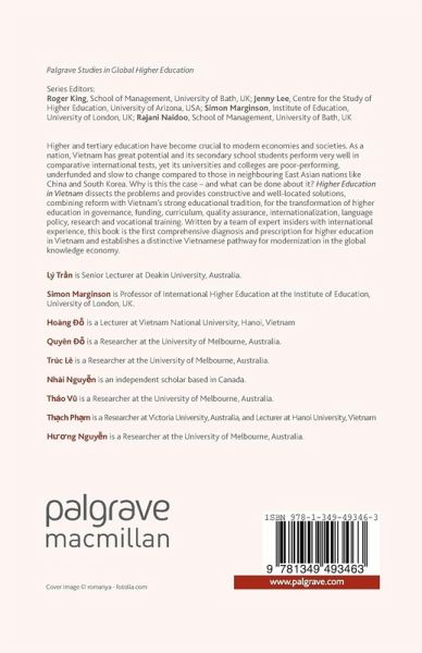 Lý Tr?n is Senior Lecturer at Deakin University, Australia. Simon Marginson is Professor of International Higher Education at the Institute of Education, University of London, UK. Hoàng ?? is a Researcher at the University of Melbourne, Australia. Quyên ?? is a Researcher at the University of Melbourne, Australia. Trúc Lê is a Researcher at the University of Melbourne, Australia. Nhài Nguy?n is an Independent Scholar based in Canada. Th?o V? is a Researcher at the University of Melbourne, Australia. Th?ch Ph?m is a Researcher at Victoria University, Australia. H??ng Nguy?n is a Researcher at the University of Melbourne, Australia.