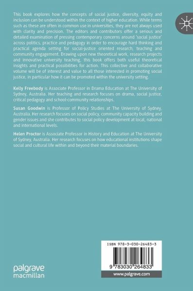 This book explores how the concepts of social justice, diversity, equity and inclusion can be understood within the context of higher education. While terms such as these are often in common use in universities, they are not always used with clarity and precision. The editors and contributors offer a serious and detailed examination of pressing contemporary concerns around 'social justice' across politics, practice and pedagogy in order to encourage hard thinking and practical agenda setting for social-justice oriented research, teaching and community engagement. Drawing upon new theoretical work, research projects and innovative university teaching, this book offers both useful theoretical insights and practical possibilities for action. This collective and collaborative volume will be of interest and value to all those interested in promoting social justice, in particular how it can be promoted within the university setting.