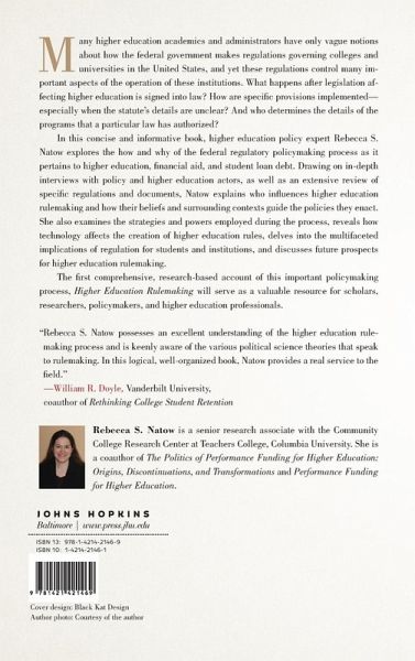 An in-depth look at how federal regulatory policy for higher education is drafted, influenced, and enacted. Many higher education academics and administrators have only vague notions about how the federal government makes regulations governing colleges and universities in the United States, and yet these regulations control many important aspects of the operation of these institutions. What happens after legislation affecting higher education is signed into law? How are specific provisions implemented--especially when the statute's details are unclear? And who determines the details of the programs that a particular law has authorized? In this concise and informative book, higher education policy expert Rebecca S. Natow explores the how and why of the federal regulatory policymaking process as it pertains to higher education, financial aid, and student loan debt. Drawing on in-depth interviews with policy and higher education actors, as well as an extensive review of specific regulations and documents, Natow explains who influences higher education rulemaking and how their beliefs and surrounding contexts guide the policies they enact. She also examines the strategies and powers employed during the process, reveals how technology affects the creation of higher education rules, delves into the multifaceted implications of regulation for students and institutions, and discusses future prospects for higher education rulemaking. The first comprehensive, research-based account of this important policymaking process, Higher Education Rulemaking will serve as a valuable resource for scholars, researchers, policymakers, and higher education professionals.
