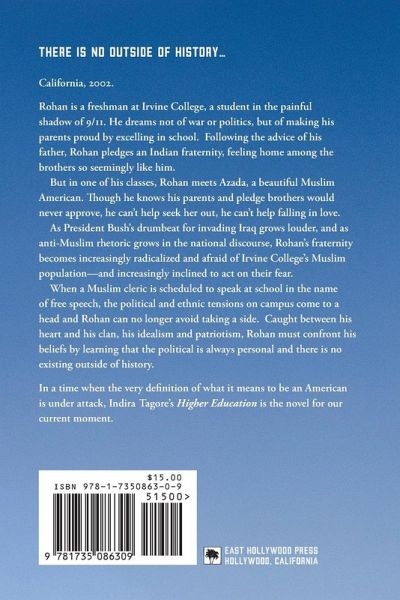 There is no outside of history... California, 2002. Rohan is a freshman at Irvine College, a student in the painful shadow of 9/11. He dreams not of war or politics, but of making his parents proud by excelling in school. Fearful of the national mood and protective of his only son, his father, a proud Indian immigrant, suggests Rohan find safety among other first-generation Indians. Dutifully, Rohan pledges a fraternity, finding friendship and acceptance among those so seemingly like him. But in one of his classes, Rohan meets Azada, a beautiful Muslim American. Though he knows his parents and pledge brothers would never approve, he can't help seek her out, he can't help falling in love. As President Bush's drumbeat for invading Iraq grows louder, and as anti-Muslim rhetoric grows in the national discourse, Rohan's fraternity becomes increasingly radicalized and suspicious of Irvine College's Muslim population. When a controversial Muslim cleric is scheduled to speak at school in the name of free speech, the political and ethnic tensions on campus come to a head and Rohan can no longer avoid taking a side. Caught between his heart and his clan, his idealism and his patriotism, Rohan must confront his beliefs by learning that the political is always personal and there is no existing outside of history. As America approaches the twentieth anniversary of 9/11, Indira Tagore's Higher Education reminds readers through brave, unflinching prose of the innocence lost and darkness unleashed in the wake of that tragedy: the Islamophobia, the xenophobia, and the domestic disorder still very much with us today. At a time when the very definition of what it means to be American is under attack, Indira Tagore's Higher Education is the literary novel for our current moment.
