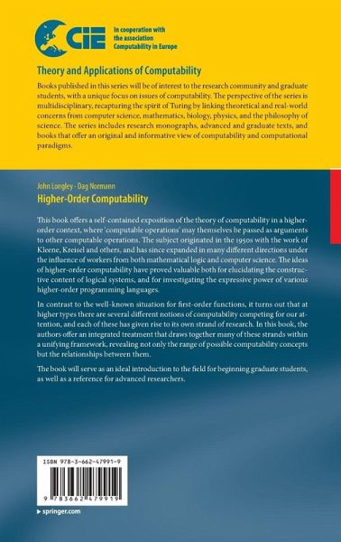 This book offers a self-contained exposition of the theory of computability in a higher-order context, where 'computable operations' may themselves be passed as arguments to other computable operations. The subject originated in the 1950s with the work of Kleene, Kreisel and others, and has since expanded in many different directions under the influence of workers from both mathematical logic and computer science. The ideas of higher-order computability have proved valuable both for elucidating the constructive content of logical systems, and for investigating the expressive power of various higher-order programming languages.