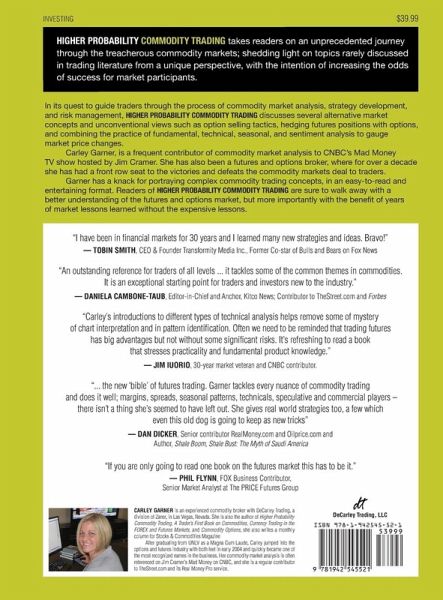 Higher Probability Commodity Trading takes readers on an unprecedented journey through the treacherous commodity markets; shedding light on topics rarely discussed in trading literature from a unique perspective, with the intention of increasing the odds of success for market participants. In its quest to guide traders through the process of commodity market analysis, strategy development, and risk management, Higher Probability Commodity Trading discusses several alternative market concepts and unconventional views such as option selling tactics, hedging futures positions with options, and combining the practice of fundamental, technical, seasonal, and sentiment analysis to gauge market price changes. Carley Garner, is a frequent contributor of commodity market analysis to CNBC's Mad Money TV show hosted by Jim Cramer and Options Insight on Bloomberg Television with Abigail Doolittle. She has also been a futures and options broker, where for over a decade she has had a front row seat to the victories and defeats the commodity markets deal to traders. Garner has a knack for portraying complex commodity trading concepts, in an easy-to-read and entertaining format. Readers of Higher Probability Commodity Trading are sure to walk away with a better understanding of the futures and options market, but more importantly with the benefit of years of market lessons learned without the expensive lessons. *THE 2016 AND 2020 PUBLICATION DATES CORRESPOND TO THE BOOK FORMAT (THE HARDBACK WAS PUBLISHED IN 2016, THE PAPERBACK IN 2020) BUT THE CONTENT IS IDENTICAL IN BOTH FORMATS.