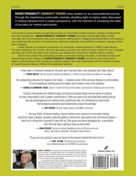 Winner of a TraderPlanet STARR award for Best Trading Book of 2016! Higher Probability Commodity Trading takes readers on an unprecedented journey through the treacherous commodity markets; shedding light on topics rarely discussed in trading literature from a unique perspective, with the intention of increasing the odds of success for market participants. In its quest to guide traders through the process of commodity market analysis, strategy development, and risk management, Higher Probability Commodity Trading discusses several alternative market concepts and unconventional views such as option selling tactics, hedging futures positions with options, and combining the practice of fundamental, technical, seasonal, and sentiment analysis to gauge market price changes. Carley Garner, is a frequent contributor of commodity market analysis to CNBC’s Mad Money TV show hosted by Jim Cramer. She has also been a futures and options broker, where for over a decade she has had a front row seat to the victories and defeats the commodity markets deal to traders. Garner has a knack for portraying complex commodity trading concepts, in an easy-to-read and entertaining format. Readers of Higher Probability Commodity Trading are sure to walk away with a better understanding of the futures and options market, but more importantly with the benefit of years of market lessons learned without the expensive lessons.