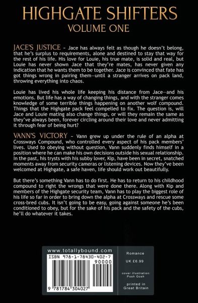 Jace's Justice Finding yourself isn't always easy-unless your true mate helps you along the way... Jace has always felt as though he doesn't belong, that he's surplus to requirements, alone and destined to stay that way for the rest of his life. His love for Louie, his true mate, is solid and real, but Louie has never shown Jace that they're mates, has never given any indication that he wants them to be together. Jace is convinced that fate has got things wrong in pairing them-until a stranger arrives on pack land, throwing everything into chaos. Louie has lived his whole life keeping his distance from Jace-and his emotions. He loves the man with a passion, but knowing Jace might be taken away from him at any moment means Louie has kept his mouth shut. Jace was found on the side of the road as a cub by their alpha, Sergeant, and Louie has always known that one day Jace's true family will come back to claim him. To save Jace having to make a painful decision-leave Louie or join his family-Louie has remained in the shadows. But life has a way of changing things, and with the stranger comes knowledge of some terrible things happening on another wolf compound. Things that the Highgate pack feel compelled to fix. The question is, will Jace and Louie mating also change things, or will they remain the same as they've always been, forever circling around their love and never admitting it through fear of being hurt? Vann's Victory Being a Dom in secret-being mated to another wolf in secret-is something Vann has always done, but now he has the chance to be open about his whole life. Vann grew up under the rule of an alpha at Crossways Compound, who controlled every aspect of his pack members' lives. Used to obeying without question, Vann suddenly finds himself in a position where he can make his own decisions outside his sexual relationship. In the past, his trysts with his subby lover, Kip, have been in secret, snatched moments away from security cameras or listening devices. Now they've been welcomed at Highgate, a safe haven, life should work out beautifully. But there's something Vann has to do first. He has to return to his childhood compound to right the wrongs that were done there. Along with Kip and members of the Highgate security team, Vann has to play the biggest role of his life so far in order to bring down the alpha at Crossways and rescue some cross-bred cubs. It isn't going to be easy, going against someone he's been conditioned to obey, but for the sake of his pack and the safety of the cubs, he'll do whatever it takes. Kip is determined to be with Vann every step of the way. Usually, Kip is submissive in all aspects of their life, preferring to bow his head and only speak when he's given permission. But their return to Crossways changes all that. The danger there is too great for Kip to wait for Vann's instructions on everything he does. Kip knows that to keep Vann safe, he must become more dominant-or die trying.