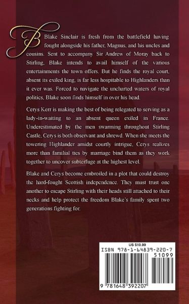 A gentle giant during peace, a bear on the battlefield... Blake Sinclair is fresh from the battlefield having fought alongside his father, Magnus, and his uncles and cousins. Sent to accompany Sir Andrew of Moray back to Stirling, Blake intends to avail himself of the various entertainments the town offers. But he finds the royal court, absent its exiled king, is far less hospitable to Highlanders than it ever was. Forced to navigate the uncharted waters of royal politics, Blake soon finds himself in over his head. A lady at court, a warrior at heart... Cerys Kerr is making the best of being relegated to serving as a lady-in-waiting to an absent queen exiled in France. Underestimated by the men swarming throughout Stirling Castle, Cerys is both observant and shrewd. When she meets the towering Highlander amidst courtly intrigue, Cerys realizes more than familial ties by marriage bind them as they work together to uncover subterfuge at the highest level. A couple underestimated, soulmates determined to win... Blake and Cerys become embroiled in a plot that could destroy the hard-fought Scottish independence. They must trust one another to escape Stirling with their heads still attached to their necks and help protect the freedom Blake's family spent two generations fighting for.