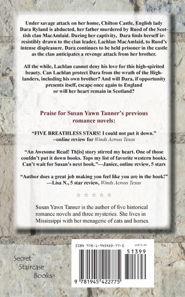 In the year 1499, King Henry VII of England and James IV, ruler of Scotland, negotiated a peace between their kingdoms which was to be sealed by a royal marriage. For a brief time it seemed the ancient hatred and bitter bloodshed between their kingdoms might cease. Only one incident marred this peace and threatened to destroy the fragile union … Under savage attack on her home, Chilton Castle, English lady Dara Ryland is abducted and her father is murdered by Ruod of the Scottish clan MacAmlaid. During months of captivity at Castle Athdair, Dara finds herself irresistibly drawn to the clan leader, Lachlan MacAmlaid, to Ruod's intense displeasure. Dara continues to be held prisoner in the castle as the clan anticipates a revenge attack from her brother. All the while, Lachlan cannot deny his love for this high-spirited beauty. Can Lachlan protect Dara from the wrath of the Highlanders, including his own brother? And will Dara, if opportunity presents itself, escape once again to England or will her heart remain in Scotland? Fans of Outlander will love this intense Highland romance. Praise for Susan Yawn Tanner's historical romances: "Action packed and poignant. ..builds tension from the very beginning and will keep you turning pages until the very end. Ms. Tanner's straightforward style never allows for a dull moment." -Linda Sandifer, author of Embrace The Wind "Susan Tanner captures the fierce independence and adventurous spirit that marked the developing West. A heart-touching read." -Elizabeth Leigh, author of Prairie Ecstasy