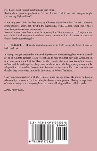 No. 2 Listopia's Scotland the Brave and then some. Reviews from previous publication: 5.0 out of 5 stars "Fall in love with Templar knight and a strong highland lass!" 4 out of 5 stars "This the first book by Cherime MacFarlane that I've read. Without giving spoilers, I enjoyed the twist in the beginning as well as Gideon's inexperience-that's something not often seen in a romance." 5 out of 5 stars I was drawn in by the opening line, "She was not pretty." In just about everything I read, everyone is so damn pretty it seems as if all characters in books are clones. Finally something else! HIGHLAND LIGHT is a historical romance set in 1308 during the Scottish war for independence. A young Scots girl cannot find a man who appreciates a headstrong plain woman. A small group of Knights Templar escape to Scotland to hide and start new lives. Among them is a young man, a ward of the Master of the Temple. The men have brought a treasure to Scotland. In exchange for a large share of the treasure, the knights may marry and be adopted into certain clans. No one must know of the agreement. Each man has a duty to the clan they are adopted into, and a duty owed to Robert The Bruce. One young man has been with the Templars since the age of ten. He knows nothing of relationships or women. Their wedding is a business arrangement. Having no experience of sex or marriage, the young couple make a game of loving and learn of life together. Let the games begin.