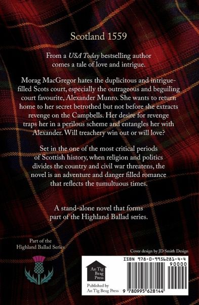 Scotland 1559 From a USA Today bestselling author comes a tale of love and intrigue. Caught reiving on Campbell land Morag MacGregor is sent to the Scottish court as a lady in waiting to the Dowager Queen. Morag hates the duplicitous and intrigue-filled Scots court, especially the outrageous and beguiling court favourite, Alexander Munro. She wants to return home to her secret betrothed, but not before she extracts revenge on the Campbells. Her desire for revenge traps her in a perilous scheme and entangles her with Alexander. Will treachery win out or will love? Set in the one of the most critical periods of Scottish history, when religion and politics divides the country and civil war threatens, the novel is an adventure and danger filled romance that reflects the tumultuous times. A stand-alone novel that forms part of the Highland Ballad series.