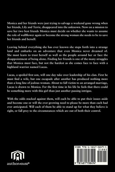 Monica and her friends were just trying to salvage a weekend gone wrong when her friends, Lily and Terrie, disappeared into the unknown. Now on a mission to save her two best friends Monica must decide on whether she wants to assume the role of wallflower again or become the strong woman she needs to be to save her friends and herself. Leaving behind everything she has ever known she steps forth into a strange land and embarks on an adventure that even Monica never dreamed of. She must learn to trust herself as well as the people around her or face the disappointment of being alone. Finding her friends is one of the many struggles that Monica must face, but not the hardest as she comes face to face with a highland warrior named Lucas. Lucas, a spoiled first son, will one day take over leadership of his clan. First he must find a wife, but one escapade after another has produced nothing more than a long line of jealous woman. About to fall victim to an arranged marriage, Lucas is drawn to Monica. For the first time in his life he feels that there could be something more with this girl than just another passing intrigue. With the odds stacked against them, will each be able to put their issues aside and become one or will the ever growing need to please be more than each had ever anticipated. Will each of them be able to stand up for what they believe is right, or fall prey to the circumstances which are out of both their control.
