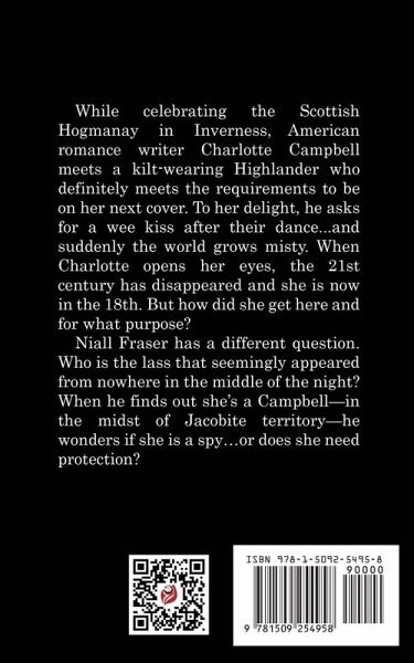 While celebrating the Scottish Hogmanay in Inverness, American romance writer Charlotte Campbell meets a kilt-wearing Highlander who definitely meets the requirements to be on her next cover. To her delight, he asks for a wee kiss after their dance...and suddenly the world grows misty. When Charlotte opens her eyes, the 21st century has disappeared and she is now in the 18th. But how did she get here and for what purpose? Niall Fraser has a different question. Who is the lass that seemingly appeared from nowhere in the middle of the night? When he finds out she's a Campbell-in the midst of Jacobite territory-he wonders if she is a spy...or does she need protection?