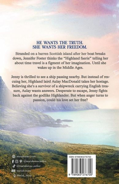 She must return to the twenty-first century. He's holding her captive. Could her love be the treasure he longs to claim? Scotland, 2022. Celebrating with friends, pediatrician Jennifer Foster is more than a little tipsy when their boat breaks down near Achleith Island. Put ashore while they wait for the coastguard, Jenny discovers a rock with strange markings. Thinking it's all a game, she high-fives the carved handprint and hurtles through time to the Middle Ages. Scotland, 1313. Highland laird Aulay MacDonald is hunting an English treasure ship that could alter the course of the war. Passing near Achleith Island, he sees a woman waving her arms. Could she be a survivor of the shipwreck? Like one of his Viking ancestors, he throws her over his shoulder and returns to Dunyvaig Castle to question his hostage. Jenny's last chance at motherhood is a fertility appointment in two weeks. But the godlike Highland laird won't let her leave. Worse, the more she sees of him the less she wants to go. Aulay hasn't let a woman get close since his wife died. But the feisty physician could heal his heart-if he can trust her. Can a woman desperate to return home and the man holding her prisoner claim a love strong enough to forge new dreams? Highlander's Claim is the ninth book in Mariah Stone's epic Called by a Highlander time-travel romance series. If you like feisty heroines, wounded heroes and fast-paced action, you'll adore this captivating enemies-to-lovers tale!
