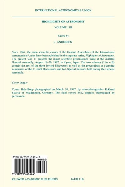 Since 1967, the main scientific events of the General Assemblies of the International Astronomical Union have been published in the separate series, Highlights of Astronomy . The present Volume 11 presents the major scientific presentations made at the XXIIIrd General Assembly, August 18-30, 1997, in Kyoto, Japan. The two volumes (11A+B) contain the texts of the three Invited Discourses as well as the proceedings or extended summaries of the 21 Joint Discussions and two Special Sessions held during the General Assembly.