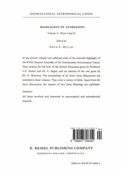 It has become a tradition in the Union to publish the Invited Discourses and the Proceedings of the Joint Discussions held at a Gene ral Assembly in a separate volume entitled HIGHLIGHTS OF ASTRONOMY. This is the fourth volume of its kind and it contains some of the scientific highlights of the Grenoble General Assembly. In order to reduce its size it was decided to publish its content in two separate parts. The part (I) contains the full texts of the In vited Discourses given by Prof. J.-C. Pecker and by Dr. C. Sagan, and an abstract of Dr. P. Morrison's paper, thus complying with his wish to forego publication of the full text of his Discourse. Furthermore it collects the proceedings of three Joint Discussions and one Joint Meeting all of which are related essentially to observations from space, to external galaxies and to cosmology. Part (n) contains the proceedings of the four Joint Discussions and one Joint Meeting related essentially to stars and the structure of our Galaxy. Clearly Volume 4 (parts I and TI) of the Highlights reflects only a part of the scientific activities which took place at the Grenoble General Assembly. Many more important papers and discussions were held during Commission meetings and joint meetings. They may be found in the Commissions' reports published in the Transactions Vol. XVI B, 1977.