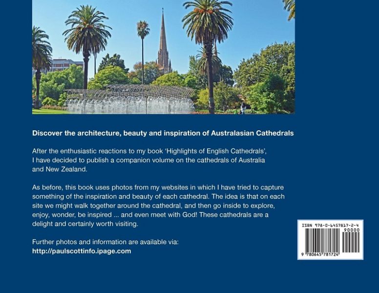 Paul Scott is a retired mathematics professor from the University of Adelaide, Australia, and a member of St Peter's Anglican Cathedral in Adelaide. His interests have included mathematics education, geometric models, playing in brass bands, photography, construction of websites, churches and cathedrals, volcanoes, lighthouses and windmills. Paul has made several trips to England with a special project in mind: photographing in some detail all the cathedrals of England. His first book is titled 'Highlights of English Cathedrals'. His second book, 'Highlights of Australiasian Cathedrals' is a companion volume on the cathedrals of Australia and New Zealand. The photographs, together with accompanying text can be viewed at: http: //paulscottinfo.ipage.com