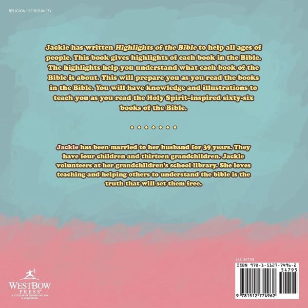 Jackie has written Highlights of the Bible to help all ages of people. This book gives highlights of each book in the Bible. The highlights help you understand what each book of the Bible is about. This will prepare you as you read the books in the Bible. You will have knowledge and illustrations to teach you as you read the Holy Spirit-inspired sixty-six books of the Bible.