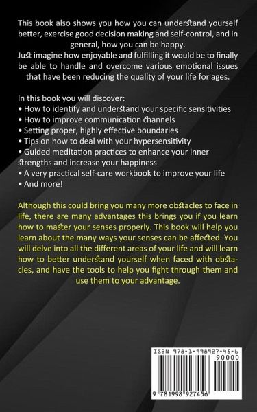 This book also shows you how you can understand yourself better, exercise good decision making and self-control, and in general, how you can be happy. Just imagine how enjoyable and fulfilling it would be to finally be able to handle and overcome various emotional issues that have been reducing the quality of your life for ages. In this book you will discover:How to identify and understand your specific sensitivities How to improve communication channels Setting proper, highly effective boundaries Tips on how to deal with your hypersensitivity Guided meditation practices to enhance your inner strengths and increase your happiness A very practical self-care workbook to improve your life And more! Although this could bring you many more obstacles to face in life, there are many advantages this brings you if you learn how to master your senses properly. This book will help you learn about the many ways your senses can be affected. You will delve into all the different areas of your life and will learn how to better understand yourself when faced with obstacles, and have the tools to help you fight through them and use them to your advantage.