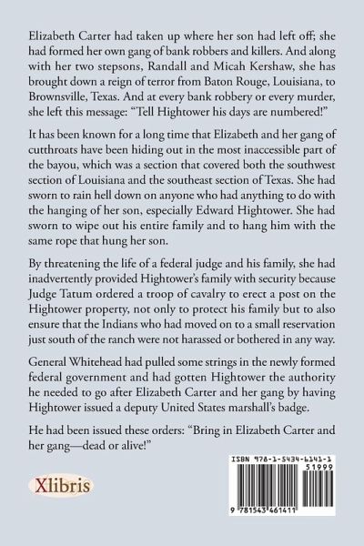Elizabeth Carter had taken up where her son had left off; she had formed her own gang of bank robbers and killers. And along with her two stepsons, Randall and Micah Kershaw, she has brought down a reign of terror from Baton Rouge, Louisiana, to Brownsville, Texas. And at every bank robbery or every murder, she left this message: "Tell Hightower his days are numbered!" It has been known for a long time that Elizabeth and her gang of cutthroats have been hiding out in the most inaccessible part of the bayou, which was a section that covered both the southwest section of Louisiana and the southeast section of Texas. She had sworn to rain hell down on anyone who had anything to do with the hanging of her son, especially Edward Hightower. She had sworn to wipe out his entire family and to hang him with the same rope that hung her son. By threatening the life of a federal judge and his family, she had inadvertently provided Hightower’s family with security because Judge Tatum ordered a troop of cavalry to erect a post on the Hightower property, not only to protect his family but to also ensure that the Indians who had moved on to a small reservation just south of the ranch were not harassed or bothered in any way. General Whitehead had pulled some strings in the newly formed federal government and had gotten Hightower the authority he needed to go after Elizabeth Carter and her gang by having Hightower issued a deputy United States marshall’s badge. He had been issued these orders: "Bring in Elizabeth Carter and her gang—dead or alive!"