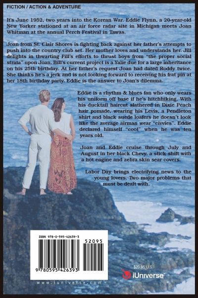 It's June 1952, two years into the Korean War. Eddie Flynn, a 20-year-old New Yorker stationed at an air force radar site in Michigan meets Joan Whitman at the annual Perch Festival in Tawas. Joan from St. Clair Shores is fighting back against her father's attempts to push into the country club set. Her mother loves and understands her. Jill delights in thwarting Fill's efforts to thrust boys from "the proper social strata" upon Joan. Bill's current project is a Yalie due for a large inheritance on his 25th birthday. At her father's request Joan had dated Roddy twice. She thinks he's a jerk and is not looking forward to receiving his frat pin at her 18th birthday party. Eddie is the answer to Joan's dilemma. Eddie is a rhythm & blues fan who only wears his uniform off base if he's hitchhiking. With his ducktail haircut slathered in Dixie Peach hair pomade, wearing his Levis, a Pendleton shirt and black suede loafers he doesn't look like the average airman wear "civvies". Eddie declared himself "cool" when he was ten years old. Joan and Eddie cruise through July and August in her black Chevy, a stick shift with a hot engine and zebra skin sear covers. Labor Day brings electrifying news to the young lovers. Two major problems that must be dealt with.