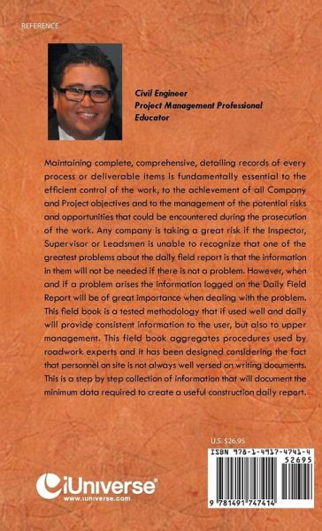 Maintaining complete, comprehensive, detailing records of every process or deliverable items is fundamentally essential to the efficient control of the work, to the achievement of all Company and Project objectives and to the management of the potential risks and opportunities that could be encountered during the prosecution of the work. Any company is taking a great risk if the Inspector, Supervisor or Leadsmen is unable to recognize that one of the greatest problems about the daily field report is that the information in them will not be needed if there is not a problem. However, when and if a problem arises the information logged on the Daily Field Report will be of great importance when dealing with the problem. This field book is a tested methodology that if used well and daily will provide consistent information to the user, but also to upper management. This field book aggregates procedures used by roadwork experts and it has been designed considering the fact that personnel on site is not always well versed on writing documents. This is a step by step collection of information that will document the minimum data required to create a useful construction daily report.