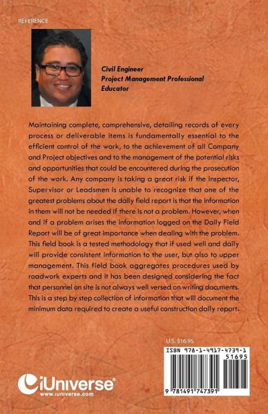 Maintaining complete, comprehensive, detailing records of every process or deliverable items is fundamentally essential to the efficient control of the work, to the achievement of all Company and Project objectives and to the management of the potential risks and opportunities that could be encountered during the prosecution of the work. Any company is taking a great risk if the Inspector, Supervisor or Leadsmen is unable to recognize that one of the greatest problems about the daily field report is that the information in them will not be needed if there is not a problem. However, when and if a problem arises the information logged on the Daily Field Report will be of great importance when dealing with the problem. This field book is a tested methodology that if used well and daily will provide consistent information to the user, but also to upper management. This field book aggregates procedures used by roadwork experts and it has been designed considering the fact that personnel on site is not always well versed on writing documents. This is a step by step collection of information that will document the minimum data required to create a useful construction daily report.