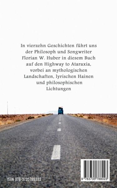 In vierzehn Geschichten führt uns der Philosoph und Songwriter Florian W. Huber in diesem Buch auf den Highway to Ataraxia, vorbei an mythologischen Landschaften, lyrischen Hainen und philosophischen Lichtungen. Aus dem Inhalt: 8samkeit, Am Rand, Odysseus' Heimkehr, Singende Asche, Kairos, Dendrosophie, Wunschgold, Anamnesis, Panta Rhei, Am Ende ein Tor, Spirit Shares!, Selbstfreundschaft, was ist das?, Highway to Ataraxia, Flussendlich