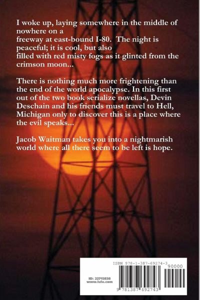 I woke up, laying somewhere in the middle of nowhere on a freeway at east-bound I-80. The night is peaceful; it is cool, but also filled with red misty fogs as it glinted from the crimson moon... There is nothing much more frightening than the end of the world apocalypse. In this first out of the two book serialize novellas, Devin Deschain and his friends must travel to Hell, Michigan only to discover this is a place where the evil speaks... Jacob Waitman takes you into a nightmarish world where all there seem to be left is hope.