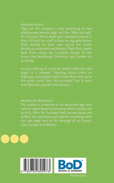 MoWuKnuffels?They are the campers's crew, consisting of two affectionate female dogs and the "little old lady" of Germany.These three girls wanted to know if they still had the stuff to take on big adventures.They started on their own across the North America continent. Their travels took them along the Canadian border, up to the Yucon and the Northwest Territories and further on to Alaska.Are you talking of a woman alone? With her two dogs? In a camper? Traveling 6.000 miles on highways and gravel roads? From New York up to the polar circle? Was this possible?Yes! It was! And they had a great time doing it ...