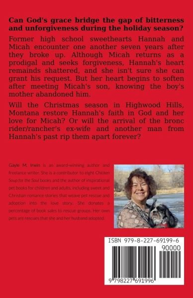 Can God's grace bridge the gap of bitterness and unforgiveness during the holiday season? Former high school sweethearts Hannah and Micah encounter one another seven years after they broke up. Hannah's heart remains shattered. Although Micah has returned as a prodigal and seeks forgiveness, Hannah isn't sure she can grant his request. But when she meets his young son, her heart begins to soften, knowing the boy's mother abandoned him and that Micah remains committed to caring for his child. Can the Christmas season in Highwood Hills, Montana restore Hannah's faith in God and her love for Micah or will the arrival of the bronc rider/rancher's ex-wife rip them apart forever and rend a little boy's heart?
