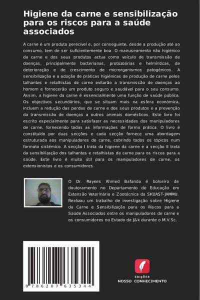 A carne é um produto perecível e, por conseguinte, desde a produção até ao consumo, tem de ser suficientemente boa. O manuseamento não higiénico da carne e dos seus produtos actua como veículo de transmissão de doenças, principalmente bacterianas, protozoárias e helmínticas, de deterioração e de crescimento de microrganismos patogénicos. A sensibilização e a adoção de práticas higiénicas de produção de carne pelos talhantes e retalhistas de carne evitarão a transmissão de doenças ao homem e fornecerão um produto seguro e saudável para o seu consumo. Assim, a higiene da carne é essencialmente uma função de saúde pública. Os objectivos secundários, que se situam mais na esfera económica, incluem a redução das perdas de carne e dos seus produtos e a prevenção da transmissão de doenças a outros animais domésticos. Este livro foi escrito especialmente para satisfazer as necessidades dos manipuladores de carne, fornecendo todas as informações de forma prática. O livro é constituído por duas secções e cada secção fornece uma abordagem estruturada aos manipuladores de carne, cobrindo todos os tópicos num formato sistémico. A secção I trata da higiene da carne e a secção II trata da sensibilização dos talhantes e retalhistas de carne para os riscos para a saúde. Este livro é muito útil para os manipuladores de carne, os extensionistas e os consumidores.