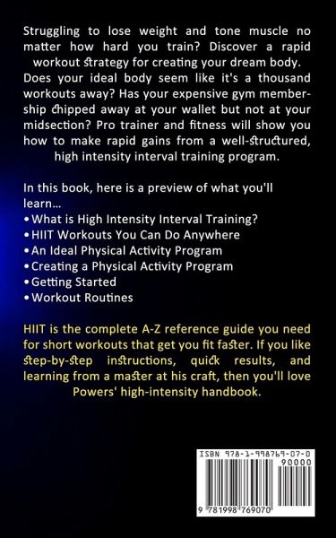 Struggling to lose weight and tone muscle no matter how hard you train? Discover a rapid workout strategy for creating your dream body. Does your ideal body seem like it's a thousand workouts away? Has your expensive gym membership chipped away at your wallet but not at your midsection? Pro trainer and fitness will show you how to make rapid gains from a well-structured, high intensity interval training program. In this book, here is a preview of what you'll learn...What is High Intensity Interval Training? HIIT Workouts You Can Do Anywhere An Ideal Physical Activity Program Creating a Physical Activity Program Getting Started Workout Routines HIIT is the complete A-Z reference guide you need for short workouts that get you fit faster. If you like step-by-step instructions, quick results, and learning from a master at his craft, then you'll love Powers' high-intensity handbook.