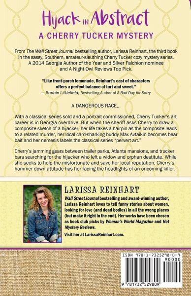 "A Rambunctious Mystery As Southern As Chess Pie And Every Bit As Delectable." From The Wall Street Journal bestselling author, Larissa Reinhart, the third book in the sassy, Southern, amateur sleuthing Cherry Tucker cozy mystery series. A 2014 Georgia Author of the Year and Silver Falchion nominee and A Night Owl Reviews Top Pick. Recipe included! "The fast-paced plot careens through small-town politics and deadly rivalries, with zany side trips through art-world shenanigans and romantic hijinx. Like front-porch lemonade, Reinhart’s cast of characters offers a perfect balance of tart and sweet." – Sophie Littlefield, Bestselling Author of A Bad Day for Sorry With a classical series sold and a portrait commissioned, Cherry Tucker’s art career is in Georgia overdrive. But when the sheriff asks Cherry to draw a composite sketch of a hijacker, her life takes a hairpin as the composite leads to a related murder, her local card-sharking buddy Max Avtaikin becomes bear bait and her nemesis labels the classical series "pervert art." Cherry’s jamming gears between trailer parks, Atlanta mansions, and trucker bars searching for the hijacker who left a widow and orphan destitute. While she seeks to help the misfortunate and save her local reputation, Cherry’s hammer down attitude has her facing the headlights of an oncoming killer. Related subjects include: cozy mysteries, women sleuths, murder mystery series, whodunit mysteries (whodunnit), humorous murder mysteries, book club recommendations, amateur sleuth books, Southern humor, strong female, female protagonist, cozy mystery arts and crafts, whimsical women sleuths. Books in the Cherry Tucker Mystery Series: A CHRISTMAS QUICK SKETCH (prequel novella) PORTRAIT OF A DEAD GUY (#1) STILL LIFE IN BRUNSWICK STEW (#2) HIJACK IN ABSTRACT (#3) DEATH IN PERSPECTIVE (#4) THE VIGILANTE VIGNETTE (Halloween novella) THE BODY IN THE LANDSCAPE (#5) A COMPOSITION IN MURDER (#6) A VIEW TO A CHILL (An Interconnected Christmas mystery) Other mystery series by Larissa Reinhart: MAIZIE ALBRIGHT STAR DETECTIVE series A FINLEY GOODHART CRIME CAPER series Reviews: "Reinhart manages to braid a complicated plot into a tight and funny tale. The reader grows to love Cherry and her quirky worldview, her sometimes misguided judgment, and the eccentric characters that populate the country of Halo, Georgia. Cozy fans will love this latest Cherry Tucker mystery." – Mary Marks, New York Journal of Books "In HIJACK IN ABSTRACT, Cherry Tucker is back--tart-tongued and full of sass. With her paint-stained fingers in every pie, she's in for a truckload of trouble." -- J.J. Murphy, Author of the Algonquin Round Table Mysteries "I love this series! Cheeky, clever, and compelling—keeps me reading way too late. This book has one of the most original—and fun—love triangles you'll ever come across." – Kaye George, Agatha Award-Nominated Author of the Imogene Duckworthy Mysteries "With a well-plotted storyline, witty banter, a warm and friendly feel and a great supporting cast that surrounds Cherry, this was very enjoyable and I am eager to read the next book in this charmingly appealing series." – Dru Ann Love, Dru’s Book Musings "Cherry Tucker's got an artists' palette of problems, but she handles them better than da Vinci on a deadline. Bust out your gesso and get primed for humor, hijackings, and a handful of hunks!" -- Diane Vallere, Author of the Style & Error and Mad for Mod Mystery Series