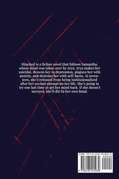 Hijacked is a fiction novel that follows Samantha, whose mind was taken over by Arya. Arya makes her suicidal, drowns her in depression, plagues her with anxiety, and destroys her with self-harm. At seventeen, she's released from being institutionalized after her second attempt on her life. She's going to try one last time to get her mind back. If she doesn't succeed, she'll die by her own hand.