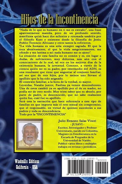 "La vida humana es una sola: siempre sagrada. El que la toca abusivamente, el que la viola sangrientamente, me ofende y me lastima a mí: nada humano me es ajeno". Conocer, a través de la ciencia quién no es su padre, por intermedio del ADN, es una resultante que tiene que angustiar al conjunto familiar,así sea que de tres hijos, por lo menos uno llevase el apellido que le ha sido asignado. El contexto familiar, a la hora de la verdad, es mayor. Leonidas, Natalia junior, Paulina ya tienen descendientes. Una de estos cambió ya su apellido por el de su madre, no podía ser de otro modo. Muy triste saber que su abuelo, por parte de padre, es desconocido, que no sabe realmente quién fue, cuál fue su apellido. Será esta la narración que hace referencia a este tipo de familias en que importa más el reto sexual sin compromiso, que el responsable, en virtud de quienes sucederán a sus padres y toda su descendencia. Todo por la "INCONTINENCIA"