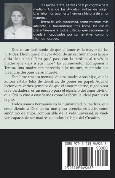 Este es un testimonio de que el amor es la mayor de las virtudes. Dicen que el mayor dolor de un ser humano es la pérdida de un hijo. Pero ¿qué pasa con la pérdida al revés: la madre que deja a sus hijos? Es conmovedor acompañar a Teresa, una madre tan parecida a la nuestra, relatando sus vivencias después de su muerte. Este libro trae un mensaje de una madre a sus hijos, que la autora estaba feliz de descifrar, de poner en papel. Aquí el lector verá varios ejemplos de que el amor materno, regado por la fe verdadera, es un ensayo para el ejercicio del amor divino, que Cristo vino a enseñarnos como la fórmula ideal para vivir la paz. Todos somos hermanos en la humanidad, y madres, que entendiendo a Dios en su más pura esencia, es decir, como sinónimo de amor, combustible de la vida universal, se vuelven capaces de ser madres de todos los hijos del Creador.