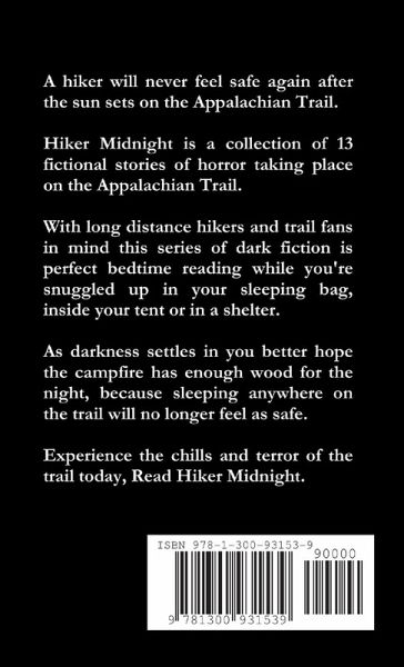 A hiker will never feel safe again after the sun sets on the Appalachian Trail. Hiker Midnight is a collection of 13 fictional stories of horror taking place on the Appalachian Trail. With long distance hikers and trail fans in mind this series of dark fiction is perfect bedtime reading while you're snuggled up in your sleeping bag, inside your tent or in a shelter. As darkness settles in you better hope the campfire has enough wood for the night, because sleeping anywhere on the trail will no longer feel as safe. Experience the chills and terror of the trail today, Read Hiker Midnight.