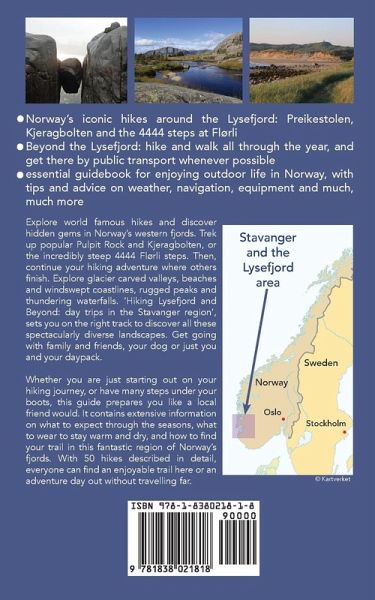 Our hiking guide prints on demand: please disregard "out of stock" notices from online retailers. Explore world-famous hikes and discover hidden gems in Norway's western fjords. Trek up popular Pulpit Rock and Kjeragbolten, or the steep 4444-step staircase at Flørli. Then, continue hiking where others finish. Explore glacier-carved valleys, windswept coastlines and beaches, rugged peaks and thundering waterfalls. 'Hiking Lysefjord and Beyond: day trips in the Stavanger Region' sets you on the right track to explore this marvellous part of western Norway. Two double-sided area maps, marked with the locations of all hikes, make it easy to orient yourself in the area. Detailed descriptions to all 50 hikes help you navigate with confidence; they provide information on how to actually find the trail head, include sketch maps as well as height profiles. Tailor your hiking adventures to the season and weather, your interests, mood and personal needs; get ideas on where to go and how to hike with children and teenagers. Essential info at your fingertips with chapters on how to enjoy outdoor life in Norway; tips and advice on weather, navigation, clothing, equipment, and much more. Insights into local history and geology, flora and wildlife create a sense of the places and people you encounter. Marvel at the astounding variety and diversity of landscapes, without travelling far, from sea-level to one thousand meters high. With 140+ full-colour photographs, hand-drawn illustrations, and detailed navigation descriptions for every hike, 'Hiking Lysefjord and Beyond: day trips in the Stavanger Region' is your in-depth guide to 'bucket list' hikes and less travelled trails. Whether you are just starting out on your hiking journey, or have thousands of steps under your boots, this guide advices you as a local friend would. Get going with family or friends, your dog, or just you and your daypack.