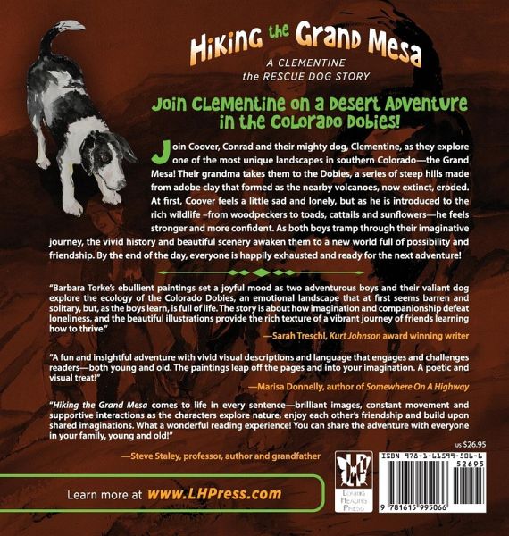 Join Clementine on a Desert Adventure in the Colorado Dobies! Join Coover, Conrad and their mighty dog, Clementine, as they explore one of the most unique landscapes in southern Colorado—the Grand Mesa! Their grandma takes them to the Dobies, a series of steep hills made from adobe clay that formed as the nearby volcanoes, now extinct, eroded. At first, Coover feels a little sad and lonely, but as he is introduced to the rich wildlife –from woodpeckers to toads, cattails and sunflowers—he feels stronger and more confident. As both boys tramp through their imaginative journey, the vivid history and beautiful scenery awaken them to a new world full of possibility and friendship. By the end of the day, everyone is happily exhausted and ready for the next adventure! "Barbara Torke’s ebullient paintings set a joyful mood as two adventurous boys and their valiant dog explore the ecology of the Colorado Dobies, an emotional landscape that at first seems barren and solitary, but, as the boys learn, is full of life. The story is about how imagination and companionship defeat loneliness, and the beautiful illustrations provide the rich texture of a vibrant journey of friends learning how to thrive." —Sarah Treschl, Kurt Johnson award winning writer "A fun and insightful adventure with vivid visual descriptions and language that engages and challenges readers—both young and old. The paintings leap off the pages and into your imagination. A poetic and visual treat!" — Marisa Donnelly, author of Somewhere On A Highway "Hiking the Grand Mesa comes to life in every sentence--brilliant images, constant movement and supportive interactions as the characters explore nature, enjoy each other's friendship and build upon shared imaginations. What a wonderful reading experience! You can share the adventure with everyone in your family, young and old!" —Steve Staley, professor, author and grandfather Be sure to check out the first in the series -- Ice Breaking: The Adventures of Clementine the Rescue Dog From Loving Healing Press www.LHPress.com
