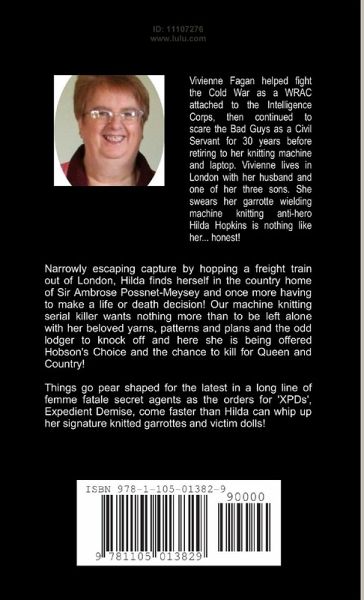Narrowly escaping capture by hopping a freight train out of London, Hilda finds herself in the country home of Sir Ambrose Possnet-Meysey and once more having to make a life or death decision! Our machine knitting serial killer wants nothing more than to be left alone with her beloved yarns, patterns and plans and the odd lodger to knock off and here she is being offered Hobson's Choice and the chance to kill for Queen and Country! Things go pear shaped for the latest in a long line of femme fatale secret agents as the orders for 'XPDs', Expedient Demise, come faster than Hilda can whip up her signature knitted garrottes and victim dolls!