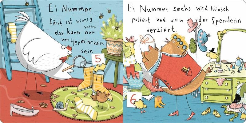 Katja Reider hat das gesamte Bilderbuch für Kinder ab zwei Jahren in Reimform geschrieben. So wird das Lernen der Zahlen bis Zehn beinahe zur Nebensächlichkeit. Denn Hilda erlebt viele Sachen auf ihrer Eiersuche. Da die Illustrationen von Sophie Schrade wunderbar farbenfroh, kindgerecht und detailreich sind, ist das Pappbilderbuch rundum gelungen und bringt Kinder zum Lachen.