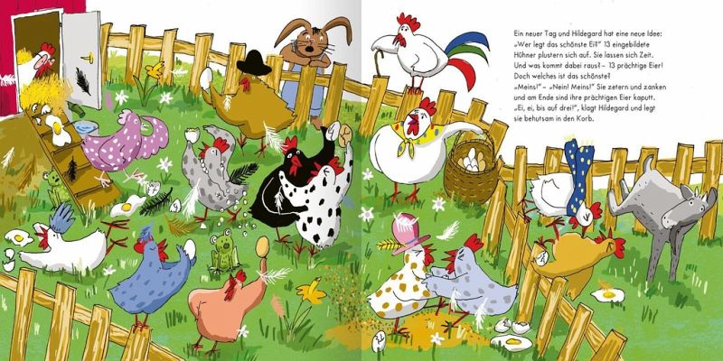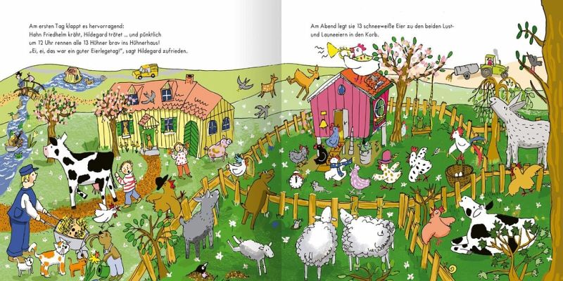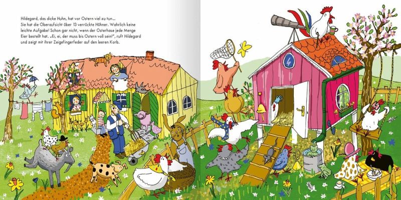 Kinderbuch für die Frühlings- und Osterzeit: Auf dem Hühnerhof von Hildegard und ihren Freunden gibt es allerhand zu entdecken und erleben!Für lustige Vorlesestunden: Die humorvolle Ostergeschichte eignet sich zum Vorlesen für Kinder ab 4 Jahren Immer wieder neu entdecken: In den Wimmelbildern sind zahlreiche lustige Details versteckt!Motivation zum Selberlesen: Zu diesem Buch gibt es ein Quiz bei Antolin.