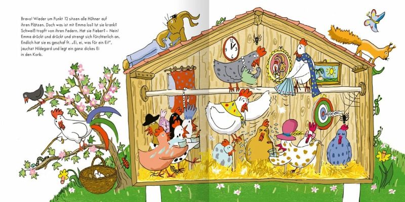 Hildegard, das dicke Huhn, hat vor Ostern viel zu tun. Der Osterhase hat jede Menge Eier bestellt und der Korb ist noch leer! Auf dem Hühnerhof ist mit all seinen Bewohnern und den quirligen Hühnern immer viel los und so ein Korb füllt sich nicht von alleine. Doch Hildegard wäre nicht das Oberhuhn, wenn sie sich nicht alle möglichen Tricks einfallen ließe, um ihre 13 verrückten Hühner zum Eierlegen zu bringen.