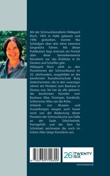 Mit der Schmuckkünstlerin Hildegard Risch, 1903 in Halle geboren und 1996, kurz vor Vollendung ihres 93. Geburtstages , gestorben, konnte Ilka Scheidgen intensive Gespräche über einen Zeitraum von knapp drei Jahren bis unmittelbar vor ihrem Tod führen. Mit dieser Publikation liegt erstmals ein Porträt über diese bemerkenswerte Künstlerin vor, das Einblicke in ihr Denken und Schaffen gibt.Hildegard Risch zählt zu den Pionierinnen der Schmuckkunst im 20. Jahrhundert, ausgebildet an der berühmten Kunsthochschule Burg Giebichenstein, die in den zwanziger Jahren ein Pendant zum Bauhaus in Dessau war. Sie hat sie alle gekannt, die berühmten Künstler vom Bauhaus: Klee, Feininger, Kandinski, Schlemmer, Mies van der Rohe. Gemeinsam mit ihrer Freundin Eva Mascher-Elsässer gründete sie in Halle unweit des bekannten Markplatzes ihre erste eigene Werkstatt.Ankäufe von Museen und Ausstellungen zeugen auch heute noch von der Bedeutung dieser Pionierin der Schmuckkunst aus Halle an der Saale. Stilsicherheit, Formgefühl und der Sinn für Schönheit zeichneten die noch im hohen Alter tätige Künstlerin aus.